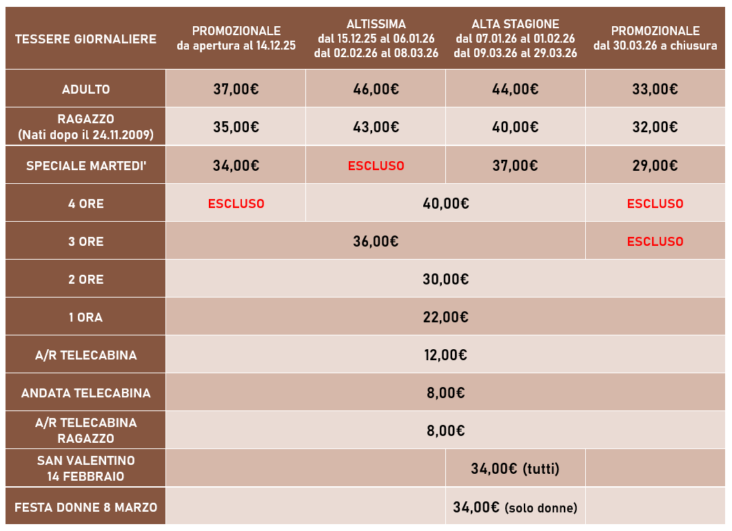 Tutte le tessere sono strettamente personali, la Key-Card è ricaricabile quante volte lo si desidera con il valore riscontrabile sul listino prezzi in vigore. Gli stagionali e i plurigiornalieri sono validi solo se accompagnati da un documento di riconoscimento dell’intestatario. Sullo Ski-Pass sono impressi sigle/simboli che identificano le distinzioni di categoria quali ADULTO, RAGAZZO, CONVENZIONATO, BAMBINO ecc.