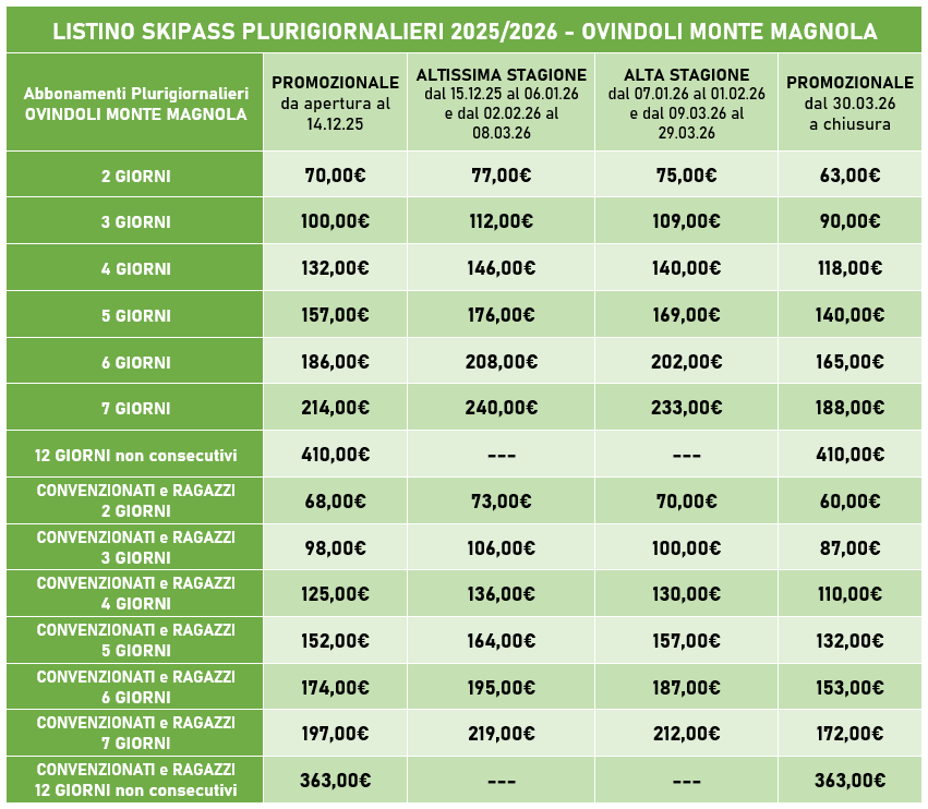 Listino skipass plurigiornalieri stagione 2025/2026 Ovindoli